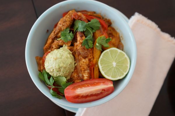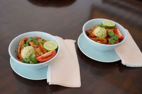 Approximately 280–285 calories per serving, including 1 tbsp guacamole but without rice or cauliflower rice.
