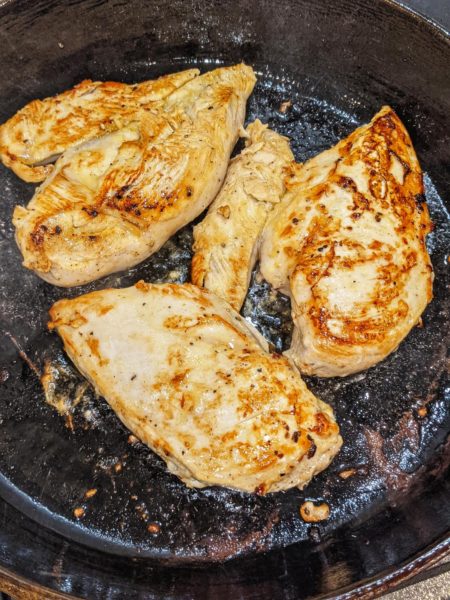 Pan fry the outside of the chicken to brown it. This will help keep the juice in the chicken breasts as well.
