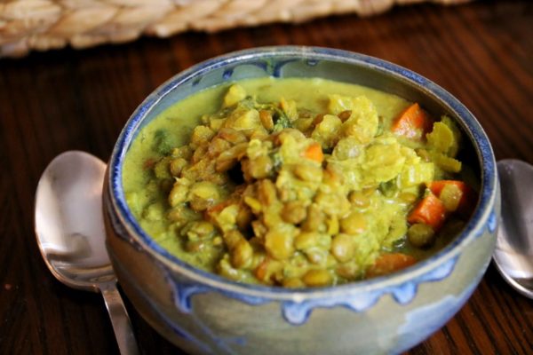 Add carrots and celery and cook 3 minutes. Add rinsed lentils, chicken stock, coconut milk and fish sauce. Bring to a low boil, then reduce heat and simmer for 25 minutes or until lentils are firm, but tender.